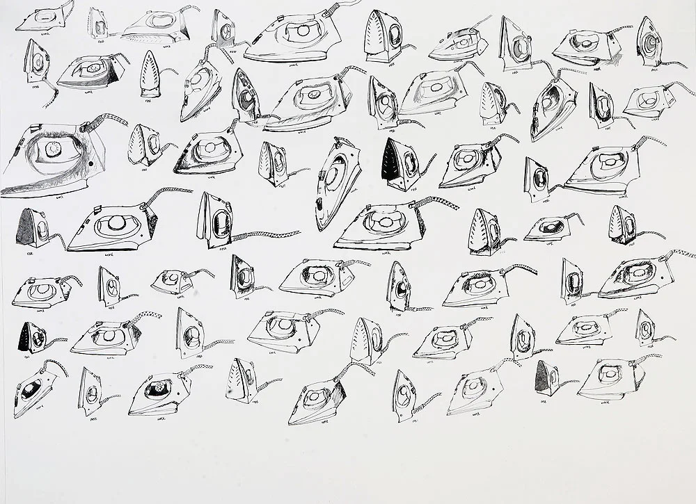 Usha Seejarim, Irony: a horizontal iron is actually working and a vertical iron is resting (2015), Liquid graphite [Zebo stove polish] on Fabriano, 1500 x 1015 mm