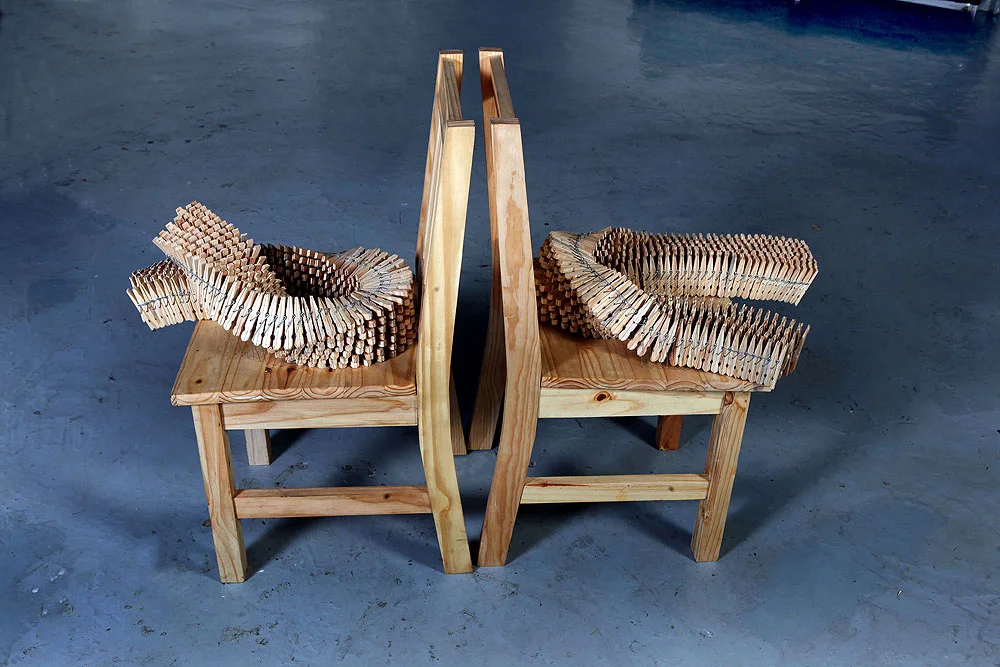 Usha Seejarim, Domestic disagreement (2015), Chairs, pegs and wire, 1310 x 910 x 460 mm